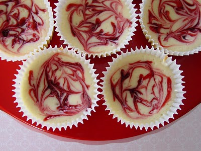 Spoon 3 tablespoons filling over crust in each cup. Dollop 1/2 teaspoon raspberry puree in a few dots over each. With a wooden skewer or toothpick, swirl sauce into filling. Place each tin in a roasting pan (bake in batches, if necessary); pour enough hot water into pan to come three-quarters of the way up sides of cups.